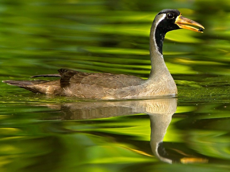 The masked finfoot is a medium-sized aquatic bird with a long, elegant neck, vivid green lobed feet, and a sharp, pointed beak. Their dramatic black facial mask is offset by a white eyering and lateral stripe along the neck. Their back and wings are deep chestnut brown, contrasting with a pale underbelly. Males have an entirely black chin, while females have a distinctive white chin patch.