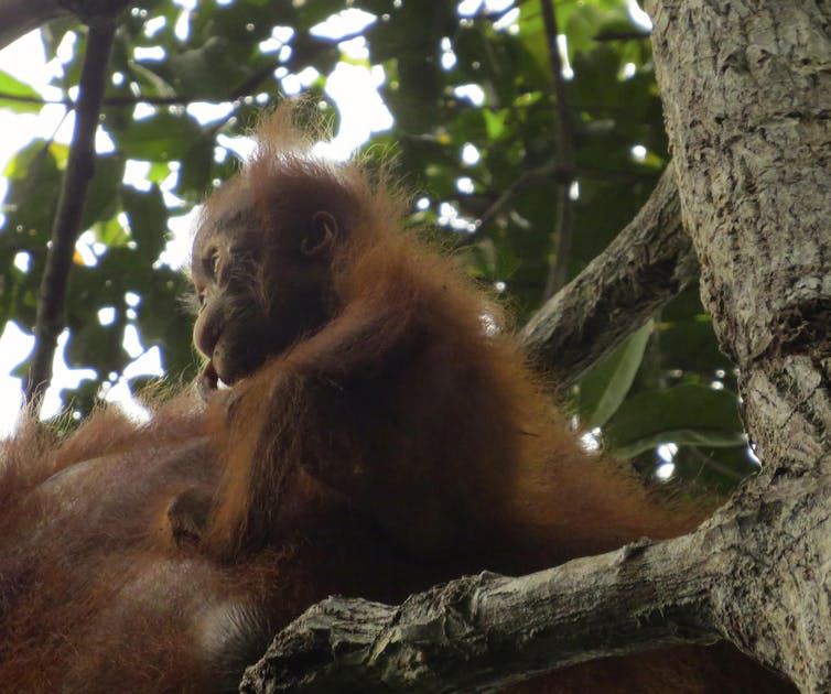 Orangutan mothers have it hard by comparison. They live alone in unpredictable environments with limited nutritional resources. In order to survive they use less energy than other great apes, raising their young more slowly.