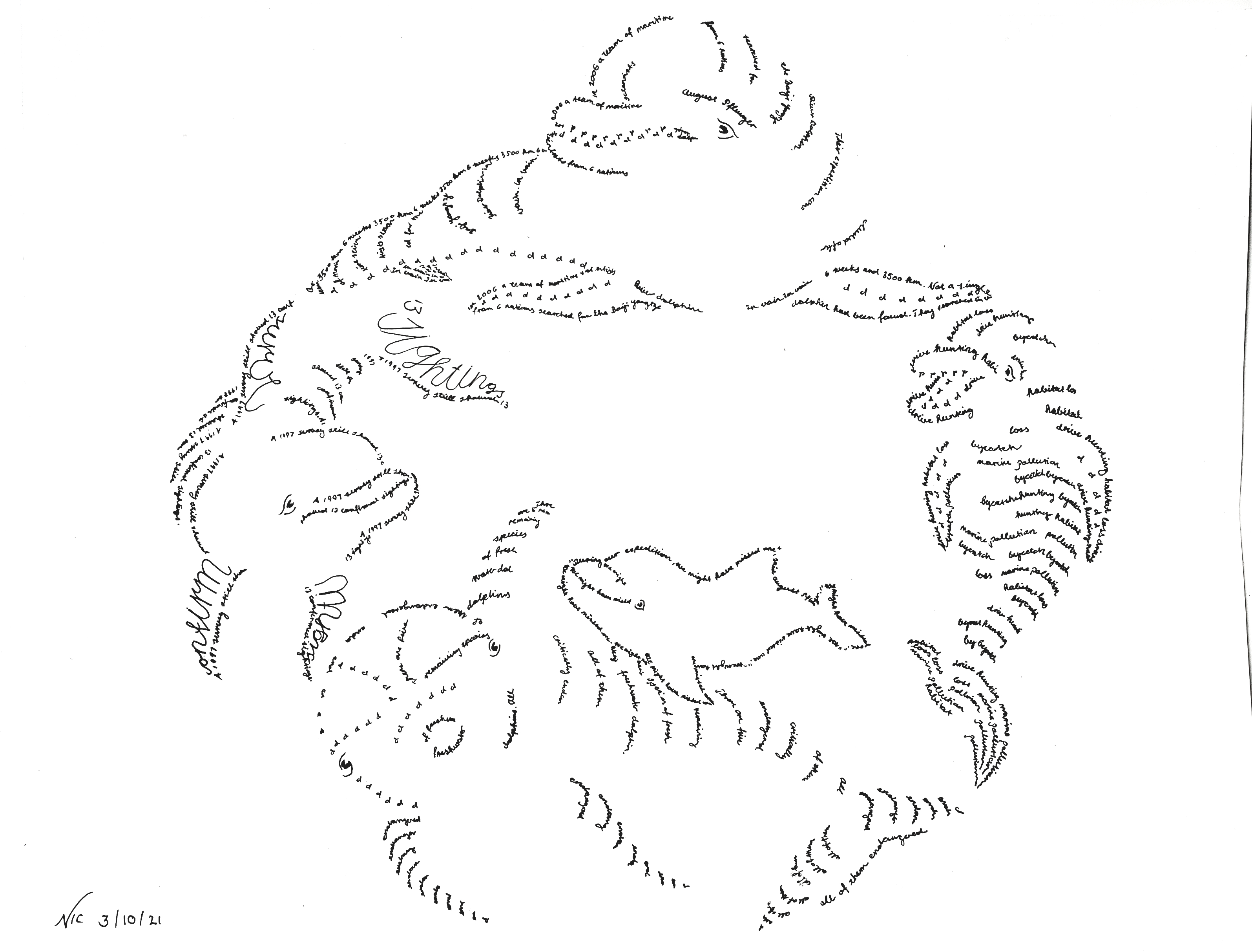 This depicts the story of the Baiji Yangtze River Dolphin, a large mammal that recently went extinct due to human interference. The fragmentary text highlights the 2006 expedition of a global team of marine scientists from six nations. The team searched the Yangtze river, covering 3,500km over 6 weeks – in vain. They did not find a single dolphin and, tragically, had to declare the Baiji Yangtze River Dolphin extinct. I created this piece for a fundraiser of The Creative Earth Projects. All auction funds went to The Dolphin Project.