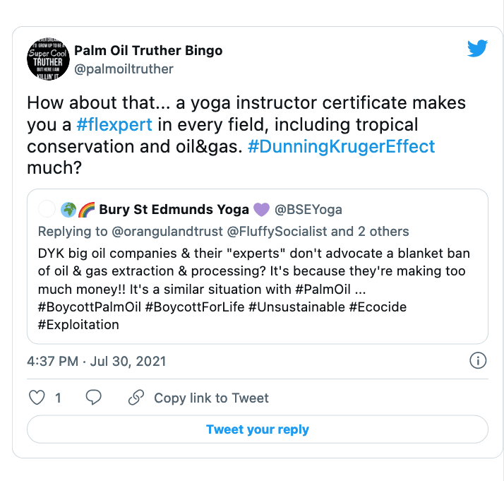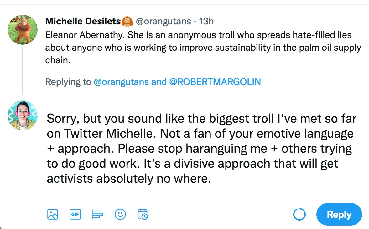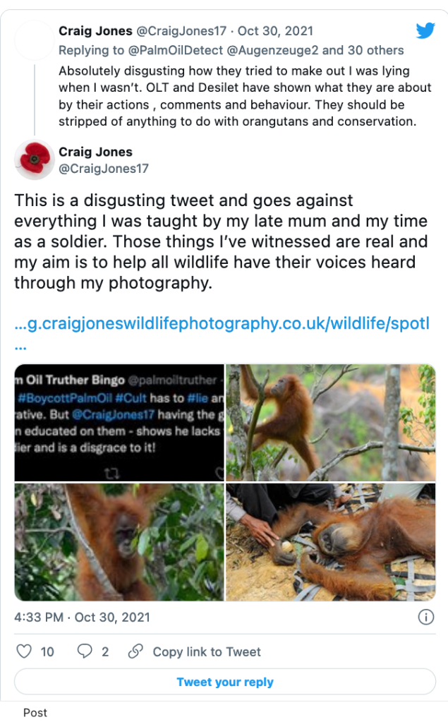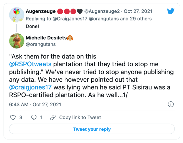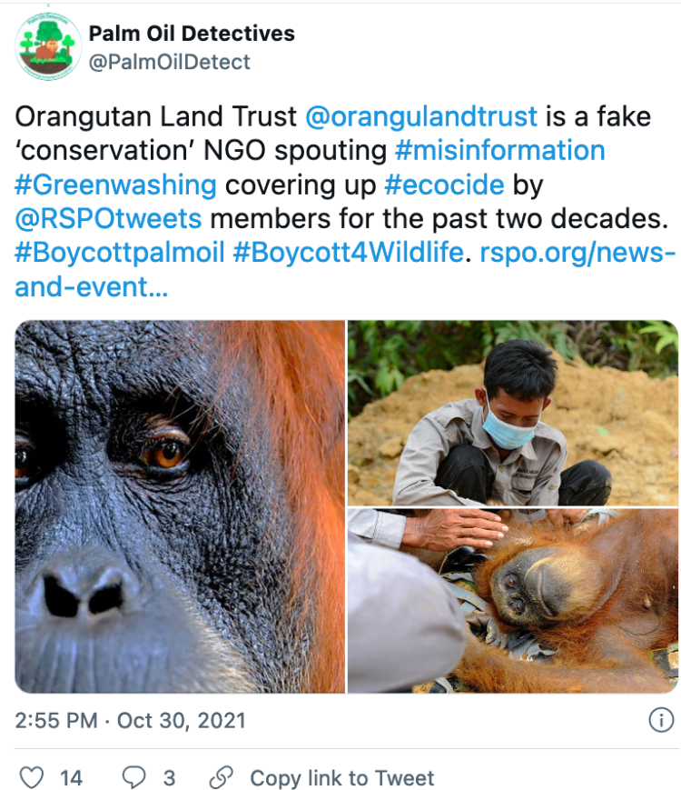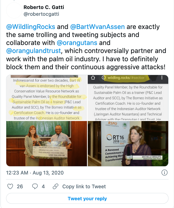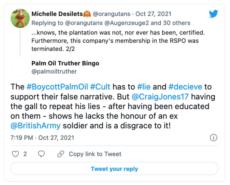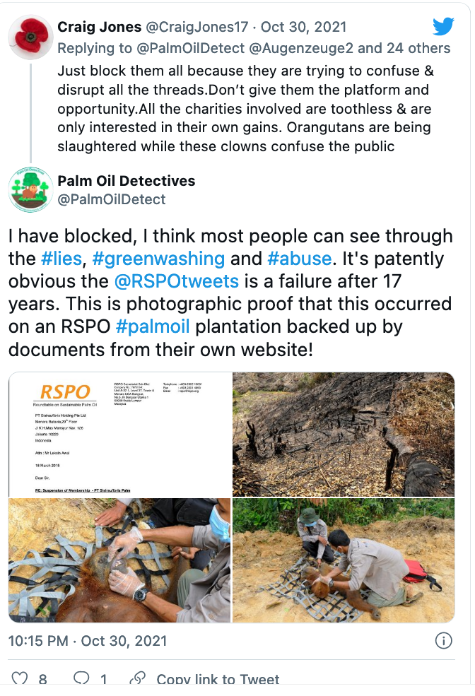 Earthkeeper22: @Earthkeeper22 parrots the exact same messages as Orangutan Land Trust despite being shown loads of evidence that it is a lie.