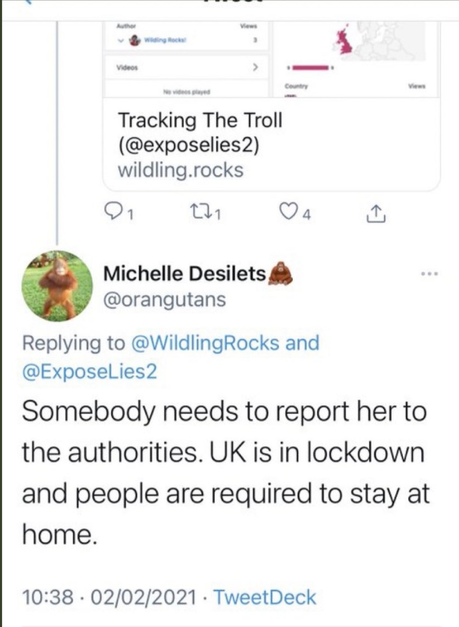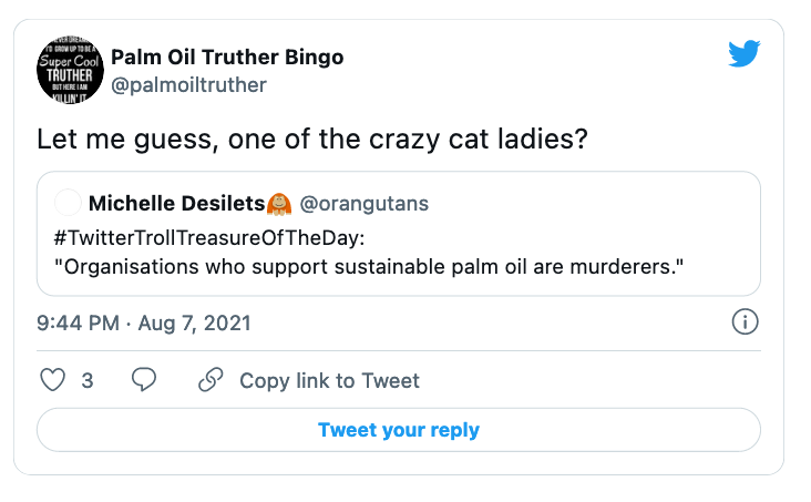 Below: Serial online abuser and greenwasher Michelle Desilets of Orangutan Land Trust cuts and pastes the same response underneath of all tweets calling for a palm oil boycott to attempt to discredit the #Boycottpalmoil #Boycott4Wildlife movement.