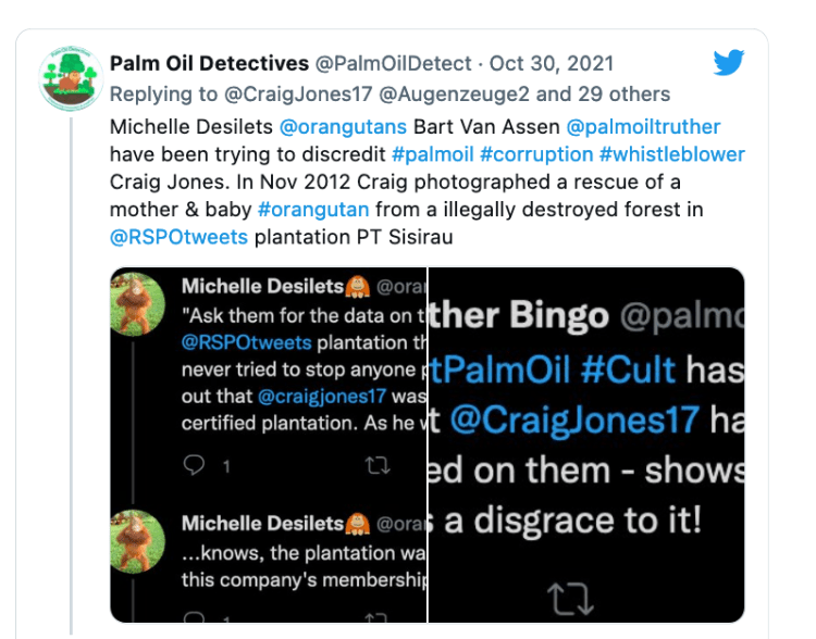 This charity’s three ‘volunteers’ Bart W Van Assen, Michelle Desilets and Jane Griffiths are responsible for most of the misinformation and greenwashing about the sustainable palm oil on social media.