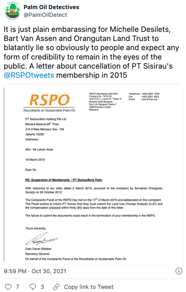Michelle Desilets who conducts greenwashing for the RSPO in her ‘volunteer’ role for Orangutan Land Trust is also on the Complaints Panel for the RSPO. She investigates complaints of human rights and labour abuses, illegal land-grabbing, ecocide and illegal deforestation on RSPO palm oil plantations. She was part of the decision-making on PT Sisirau, so her tweets are a blatant lie that has been caught out.