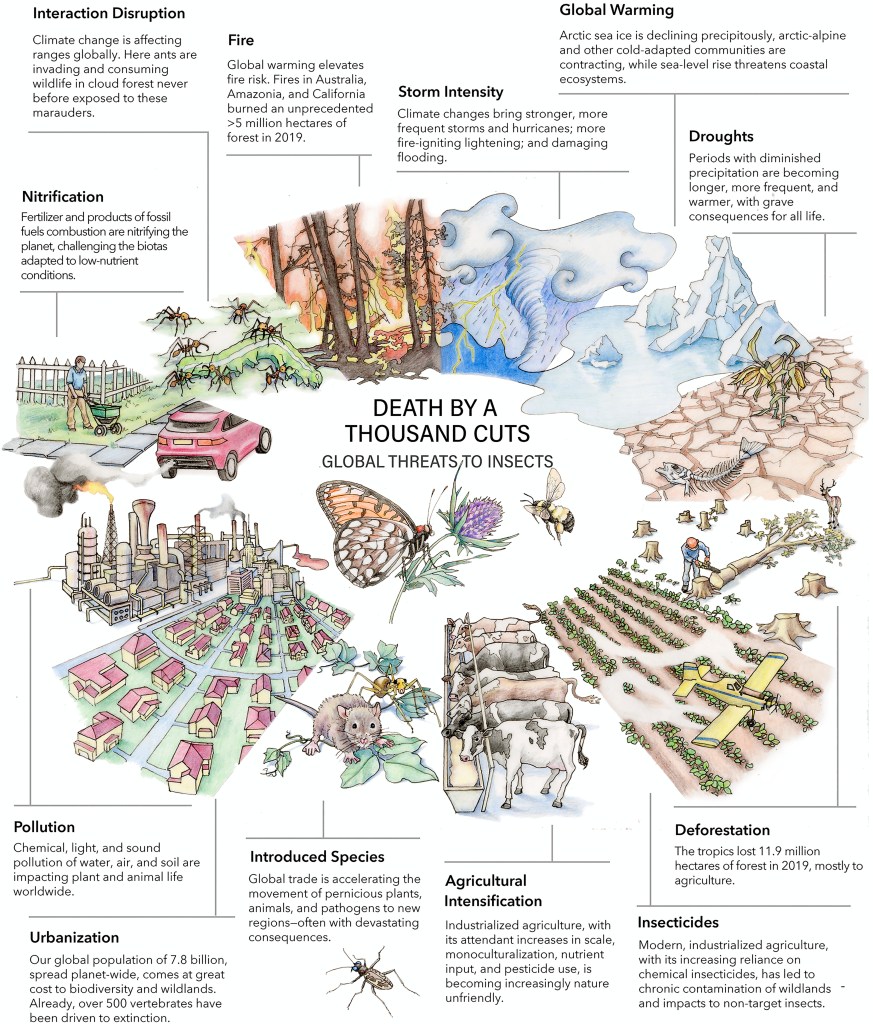 “multiplicity of factors, most likely with habitat destruction, deforestation, fragmentation, urbanization, and agricultural conversion being among the leading factors” (40). His assessment seems to capture the essence of the problem: Insects are suffering from “death by a thousand cuts” (Fig. 1).