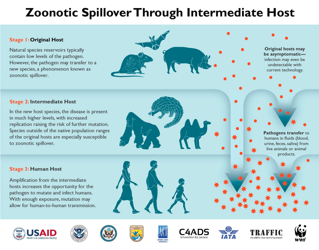 Zoonotic spillover requires close contact between a human and an animal or its organic material. This occurs when humans destroy rainforest ecosystems for industrial agriculture, rapid urbanisation, mining or other land conversion. Illegal wildlife hunting, bushmeat trade and the illegal pet trade expose humans to new pathogens from these wild animals. This pathogen transfer is the zoonotic spill-over from wild animal hosts to human hosts.