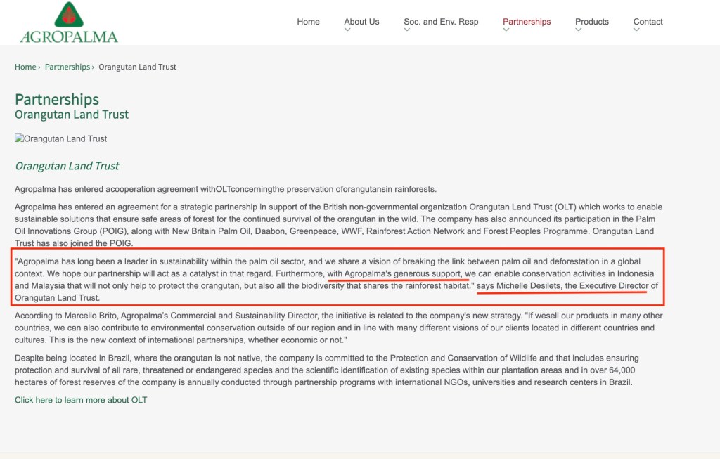 Orangutan Land Trust mentions fellow RSPO member Agropalma as being a sponsor and funder on their website and annual ACOP ( a report given to the RSPO) in 2014. Agropalma are listed on the OLT website until 2019.