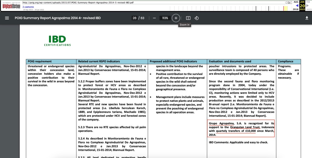 A report by the Palm Oil Innovation Group (POIG) on their website between 2014-2020 reveals that Agropalma have been paying Orangutan Land Trust 10,000 GBP per quarter. Read report