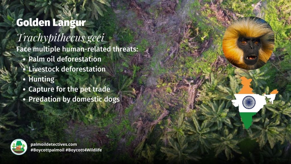 The greatest challenges facing the golden langur are palm oil, charcoal and meat deforestation, human-wildlife conflict, poaching and collection for the illegal pet trade. These threats destroy the forests these remarkable primates depend on, isolate populations, and expose them to increased risk of disease and predation. Effective protection requires indigenous-led conservation, agroecology, and the safeguarding of forest ecosystems from further destruction. Help them every time you shop and be (Biswas et al., 2020; Das et al., 2021).