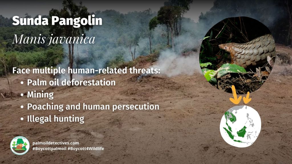 Sunda Pangolins are heavily threatened and are now critically endangered. Their main threat is from hunting and poaching for local and international use. Their secondary threat is habitat destruction across their range for palm oil, timber and other crops.