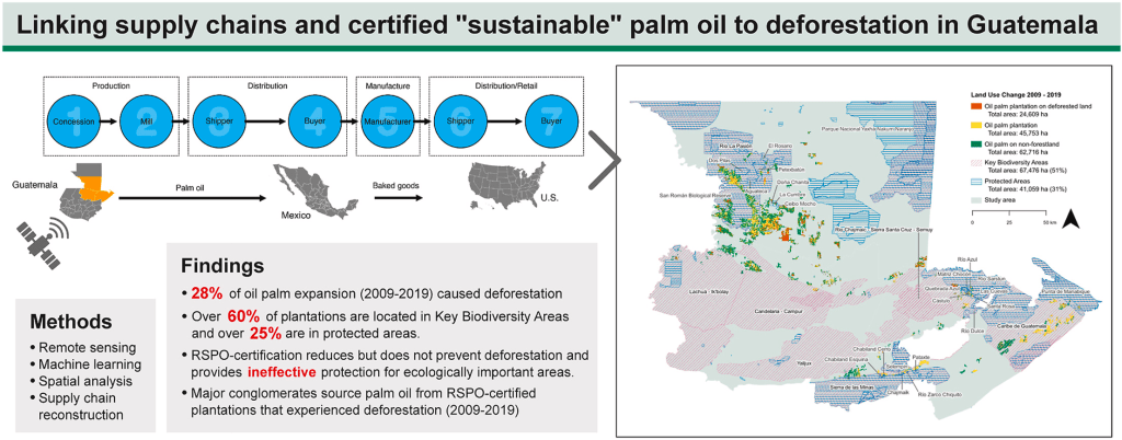 The study used satellite imagery and machine learning to quantify deforestation attributable to palm oil plantation expansion in Guatemala over a decade, 2009-2019. In addition, the researchers used shipment records and other data sources to reconstruct corporate supply chains and to link transnational conglomerates to palm oil-driven deforestation.