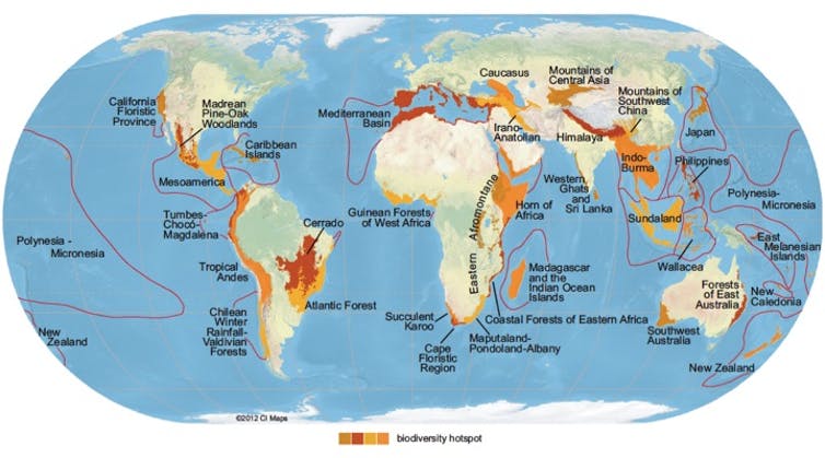 Most of Earth’s restricted endemics reside in “biodiversity hotspots”, defined by having more than 1,500 locally endemic plant species and less than 30% of their original habitat remaining. Of 35 currently recognised hotspots, half are in the species-rich tropics with the remainder divided among Mediterranean, islands and other ecosystems.