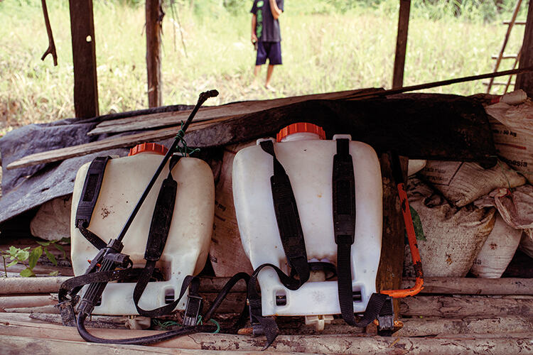 ‘Palm oil means Gramoxone, Gramoxone means palm oil’, says James Watt, a farmer in Bangkal. Watt is among the few residents who still have a small piece of land left: he used to grow rubber plants, fruit and vegetables. He started life as a traditional farmer and had no interest in palm oil cultivation. But as the vast plantations came to dominate the region, he was forced to switch. Around the same time, in 2015, he was introduced to paraquat, under the label Gramoxone. ‘I needed a stronger herbicide, and I went to the shop in Sampit, the nearest city. I asked the shopkeeper for advice, and he gave me this,’ Watt says, holding out the five-litre plastic package of the substance. Paraquat became a familiar household item and can be found in most farmers’ houses in Bangkal. ‘When I have to spray it, I smoke a cigarette first, so I make sure of the wind direction,’ Watt says.