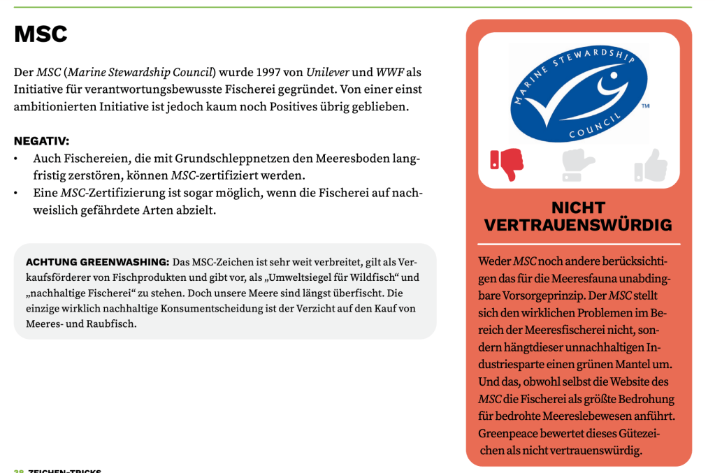 Greenpeace has singled out certain labels, such as the MSC certification for fish and the RSPO label for palm oil, as potentially harmful to environmental goals. Meanwhile, some labels remain credible, including Demeter, “Prüf nach!” and Bio Austria.