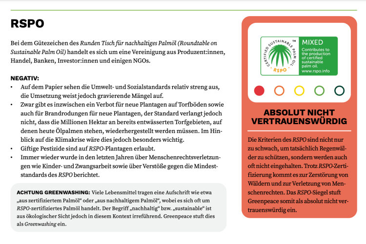 The report itself is in German and can be read here. The RSPO and MSC sections have been machine translated below for your convenience. Greenpeace considers both MSC and RSPO ecolabels to be “absolutely untrustworthy” for consumers in 2025.